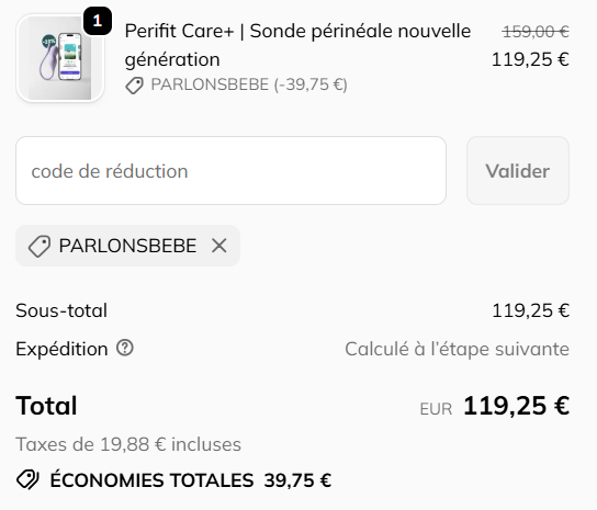 - Dans la section réservée aux remises, situées en haut à droite de l’écran, renseignez le code promo Perifit correspondant à l’offre, à savoir PARLONSBEBE ou PBPUMP25.